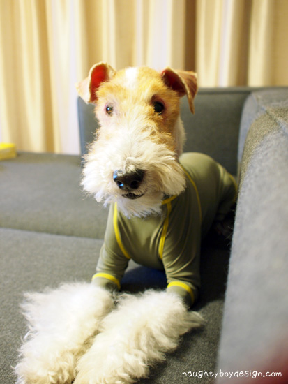 トリミングの後、洋服を着せられてふて腐れてるロビエルです。